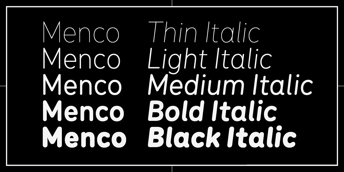 Menco was inspired by the lettering of engineering, found on blueprints, mechanical drawings, stencils and templates. The family has 5 weights, ranging from Thin to Black (including italics) and is ideally suited for advertising and packaging, editorial and publishing, logo, branding and creative industries as well as small text. Menco provides advanced typographical support with features such as case-sensitive forms, fractions, super- and subscript characters, and stylistic alternates. It also comes with tabular lining and proportional lining figures.
